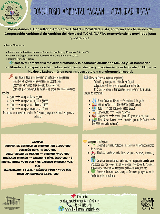 El proyecto busca establecer un modelo de movilidad solidaria y economía circular, derivado de los Acuerdos de Cooperación Ambiental de América del Norte (ACAAN), utilizando vehículos y maquinaria en desuso de EE.UU. para proyectos de transporte, infraestructura y asistencia comunitaria en México y Latinoamérica. La iniciativa combina logística binacional, importación legal de vehículos y distribución estratégica, promoviendo derechos humanos y sustentabilidad ambiental. Se plantea como un caso piloto de cooperación transfronteriza que integra tecnología, economía circular y justicia social.